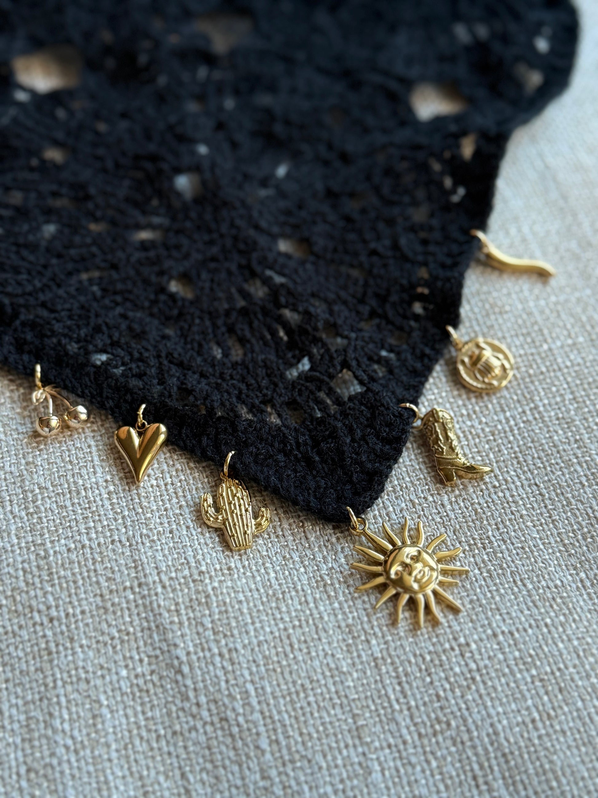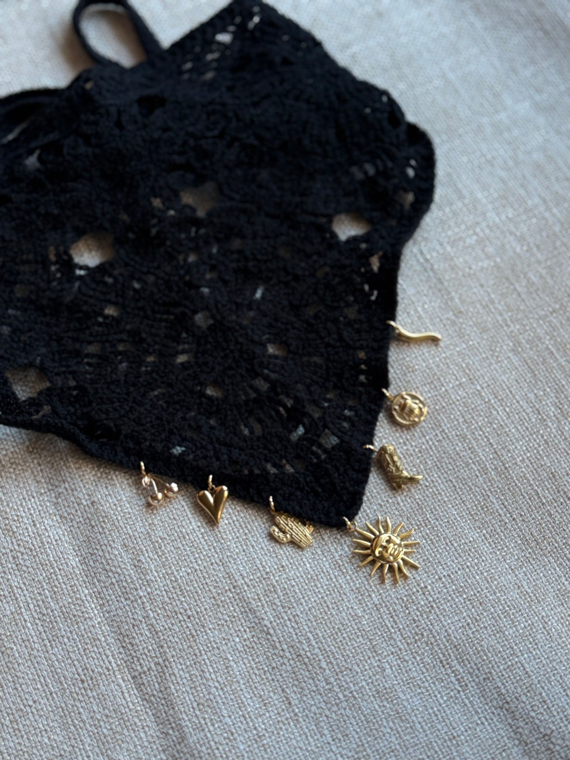Ajoutez du style à votre tenue avec ce bandana crocheté en coton, agrémenté de sept charms personnalisables, en acier inoxydable plaqué or. Son style léger et original permet d’exprimer votre personnalité avec une pincée de fun et d’élégance. Parfait pour des looks décontractés qui ne manquent pas de charme ! Portez le autour du cou ou dans les cheveux.