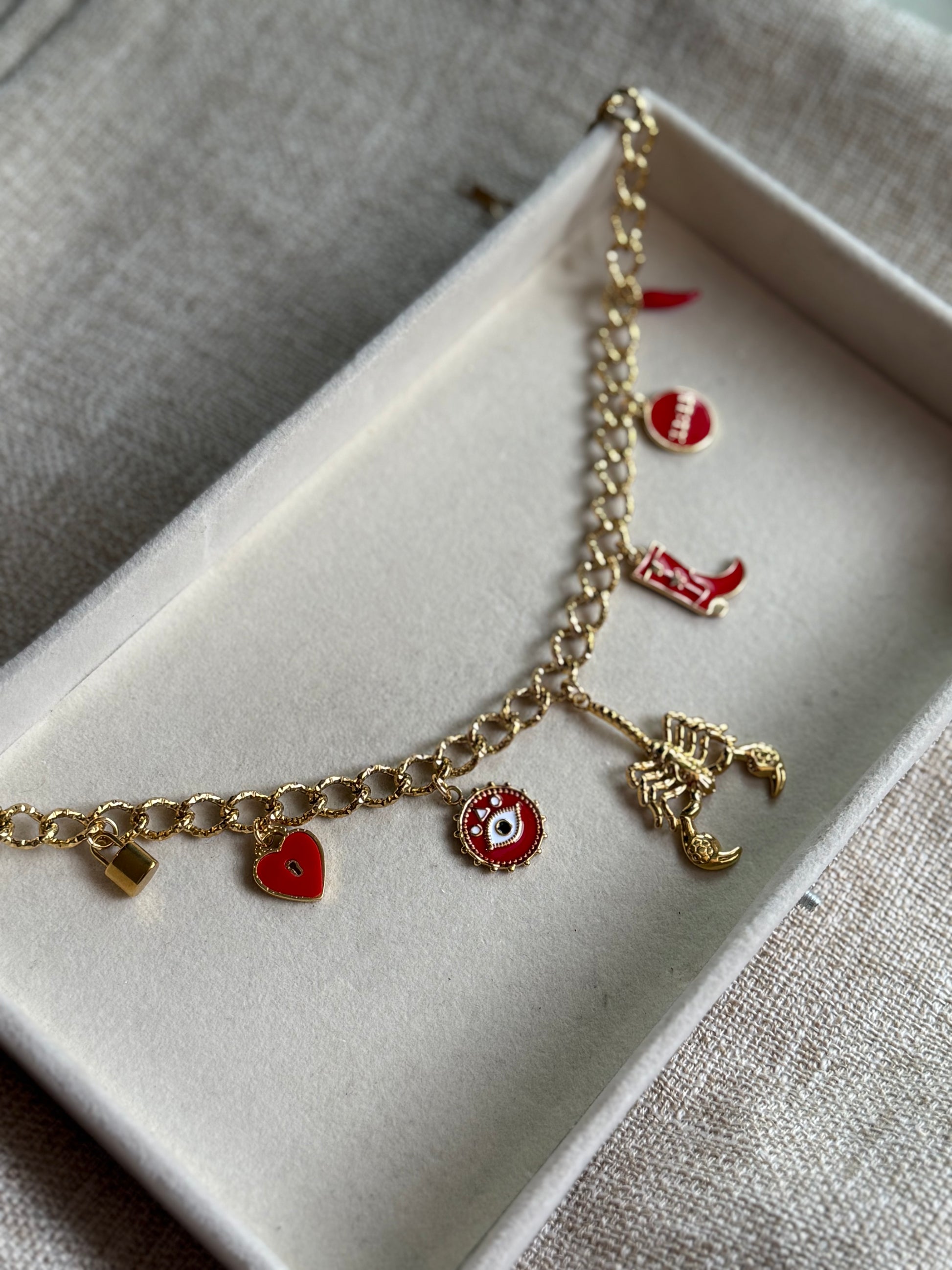 Elle a choisi une chaîne à maillon épais car elle aime les bijoux qui changent un look du tout au tout. Pour la composition; elle a jeté son dévolu sur un grande scorpion car c’est son signe astrologique. Pour l’accompagner, elle a choisi une botte Santiag rouge car c’est clairement ses chaussures préférées. Nous avons ensuite l’œil de protection rouge car il est tatoué sur sa peau, et le piment car c’est une fille des îles qui adore la cuisine hot ! Pour finaliser sa jolie composition, elle a choisi le cadenas + le cœur cadenas pour représenter la sécurité, ses amis et sa famille, puis l’heure miroir 11:11 pour évoquer sa spiritualité.