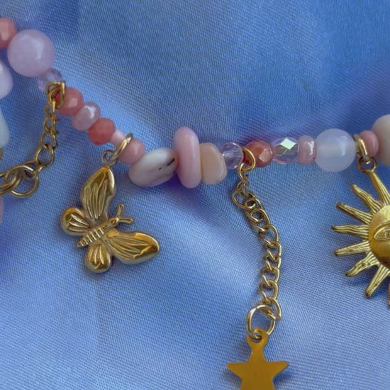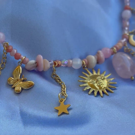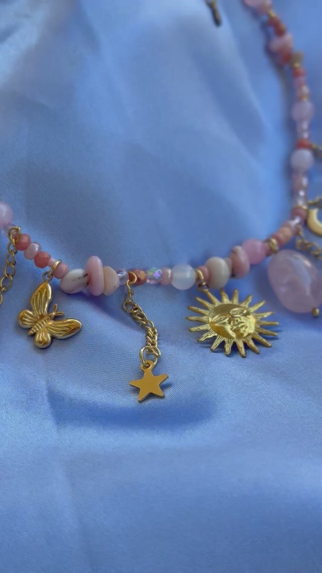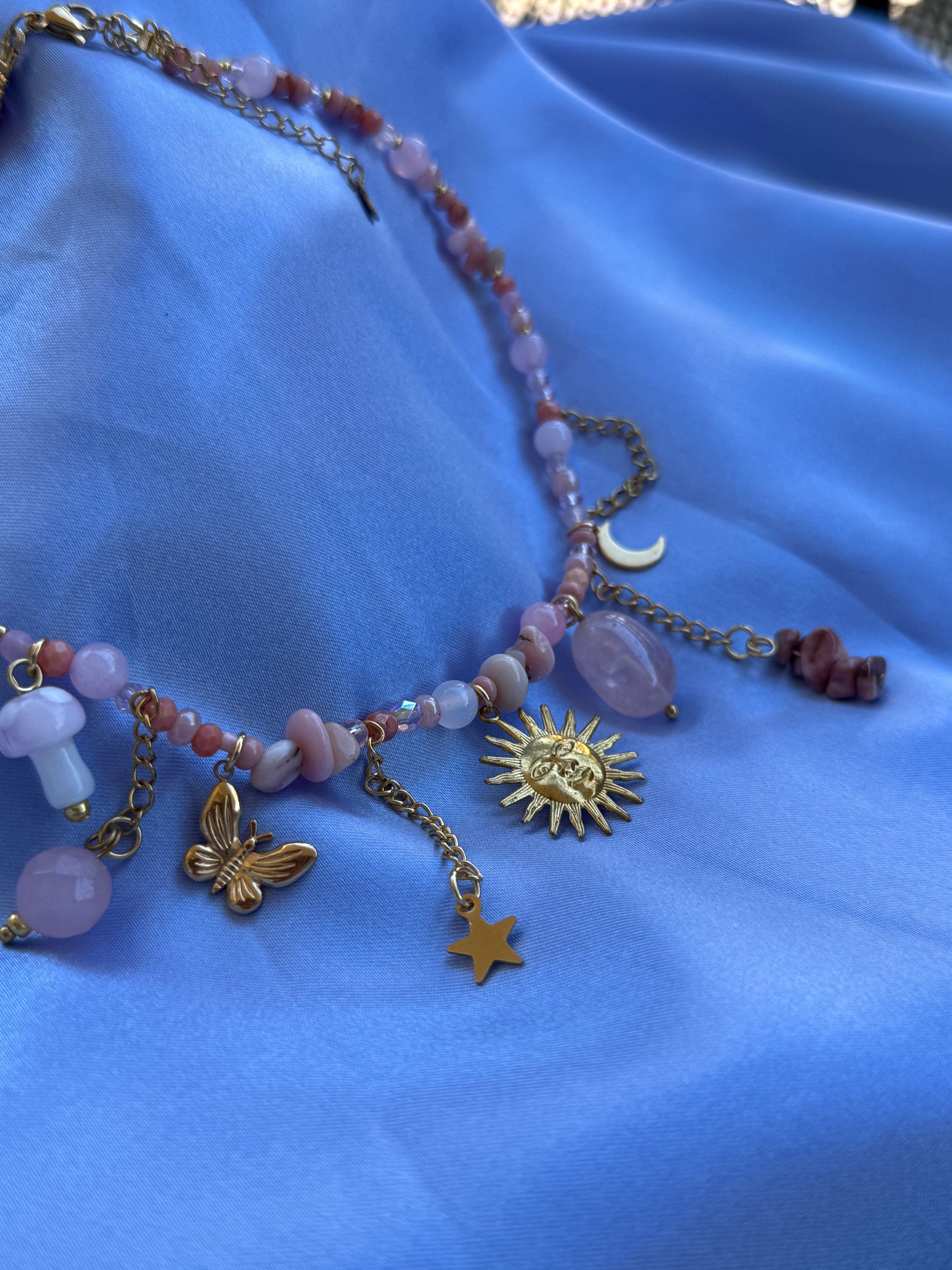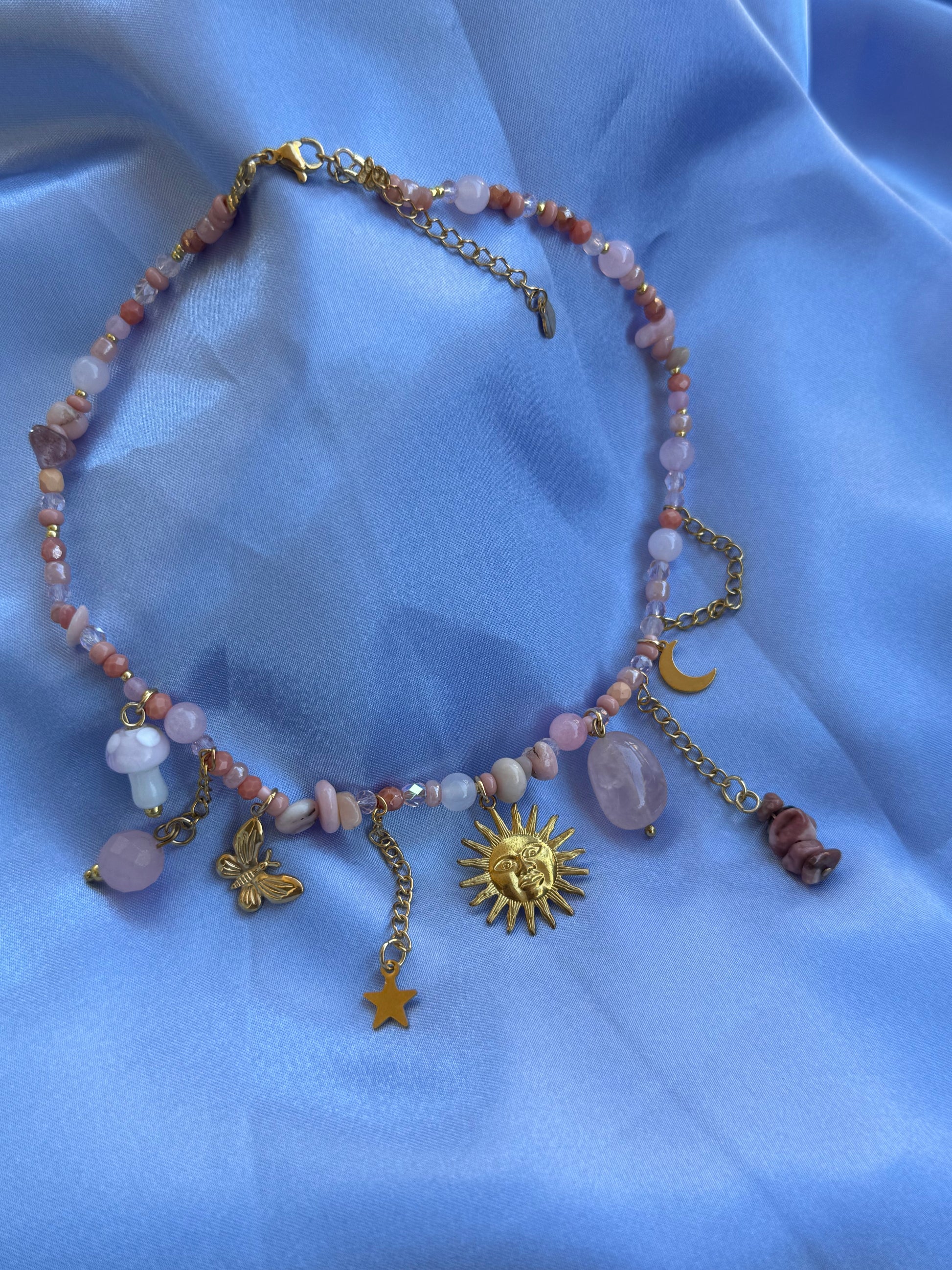 Plongez dans la magie avec ce collier Enchanted Garden n°8, inspiré de la forêt enchantée. Sa teinte rose délicate et ses détails en acier inoxydable plaqué or apportent une touche légère et durable à votre look. Mesurant 36 cm avec une chaînette d’extension, il s’adapte à toutes vos envies. Création unique spécialement conçue pour l'événement Noctambule à l’abbaye de Valmagne, ce bijou vous invite à un enchantement sans fin.