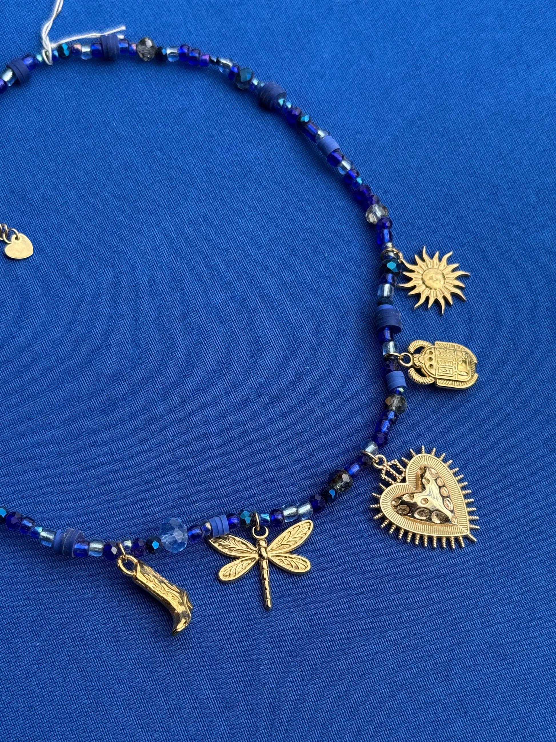 Notre collier Tamarindo vous invite au voyage et vous transporte vers les plages du Costa Rica. Son camaïeu de bleus et ses breloques en acier inoxydable plaqué or en font une pièce chic et luxueuse, des plus uniques pour égayer votre look estival.
