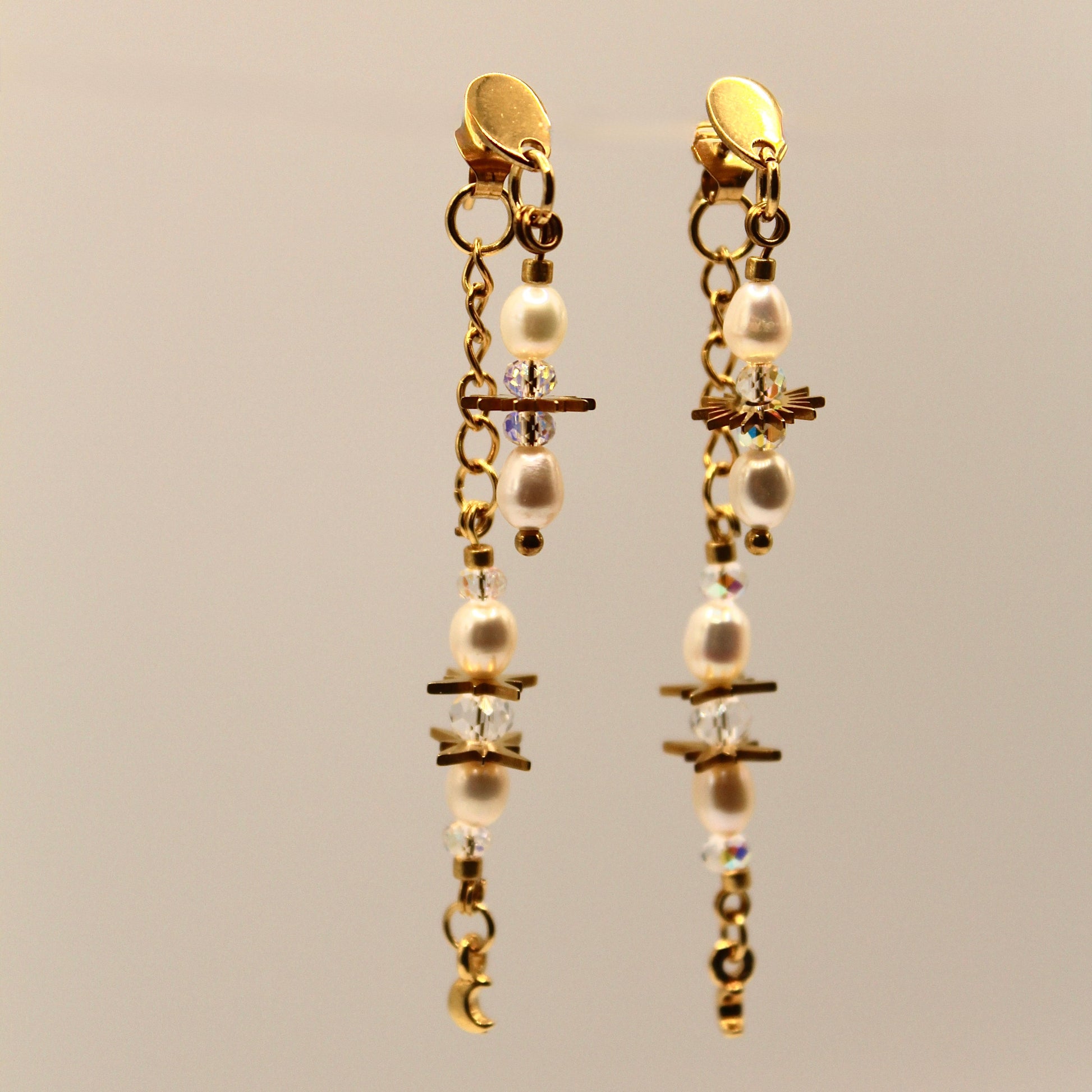 Découvrez notre mono boucle Céleste, une boucle d'oreille pendante qui joue avec la lumière ! Confectionnée en acier inoxydable résistant, elle associe l'élégance brute des perles d'eau douce aux reflets chatoyants des perles de verre à facettes multicolores. Chaque boucle est unique, fabriquée à la main, avec ses imperfections charmantes qui racontent une histoire. Légères et confortables, elles ajoutent une touche bohème, chic, et pétillante à votre style, du quotidien aux occasions spéciales.