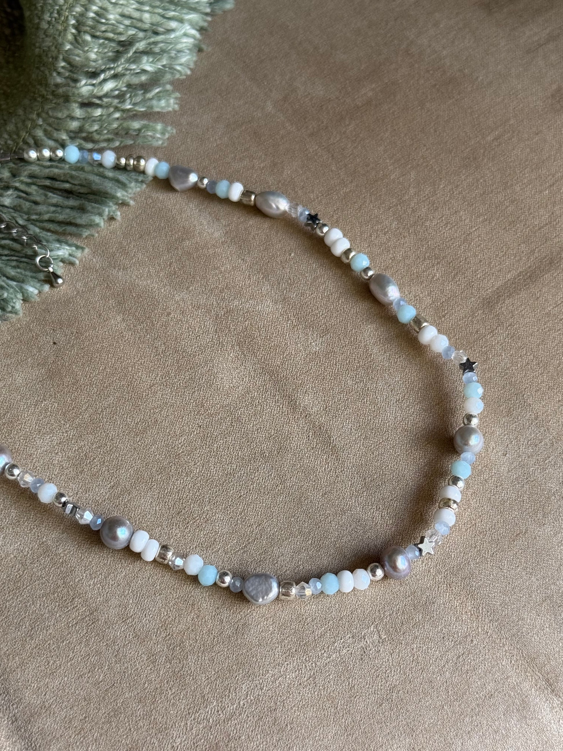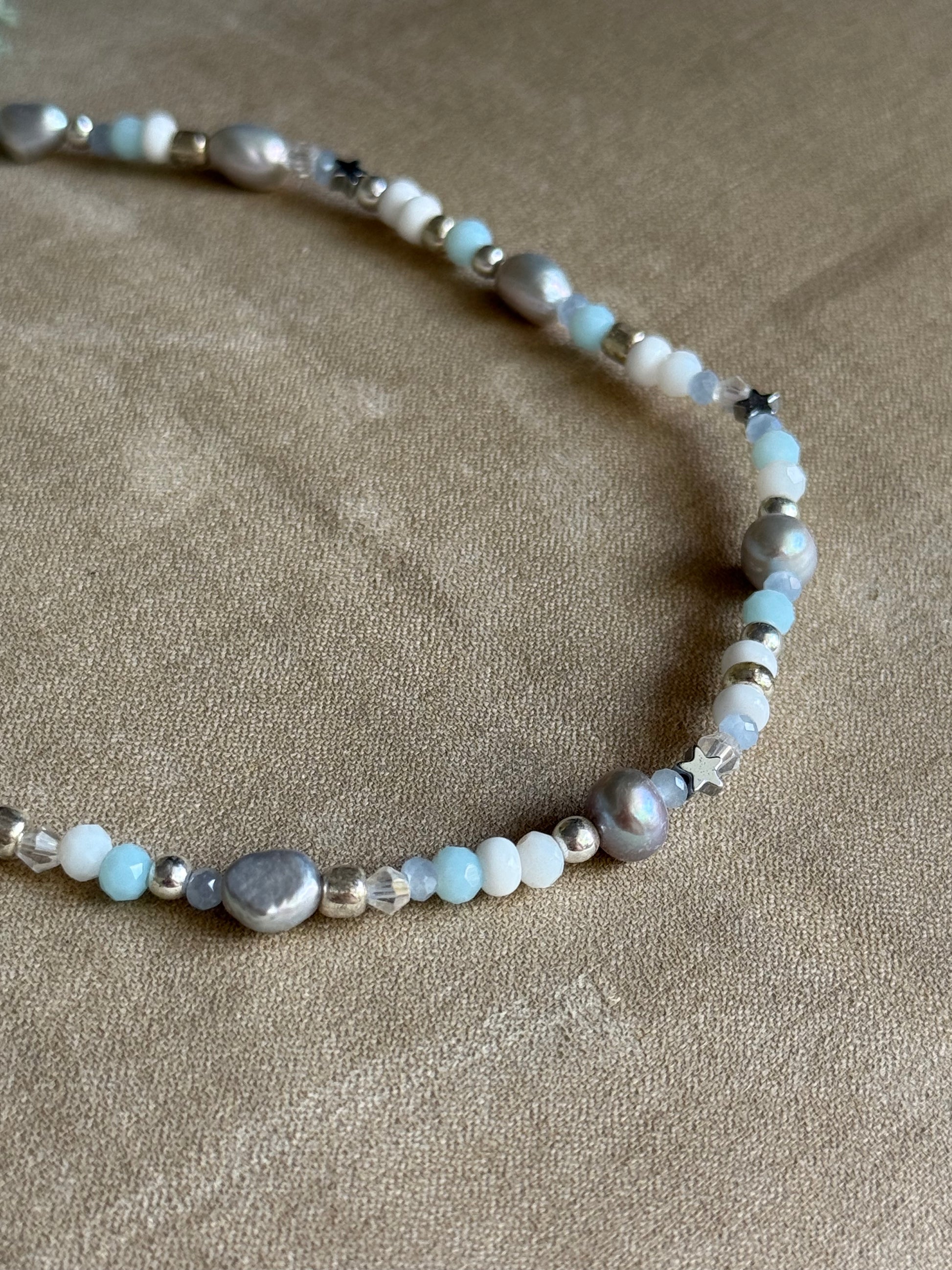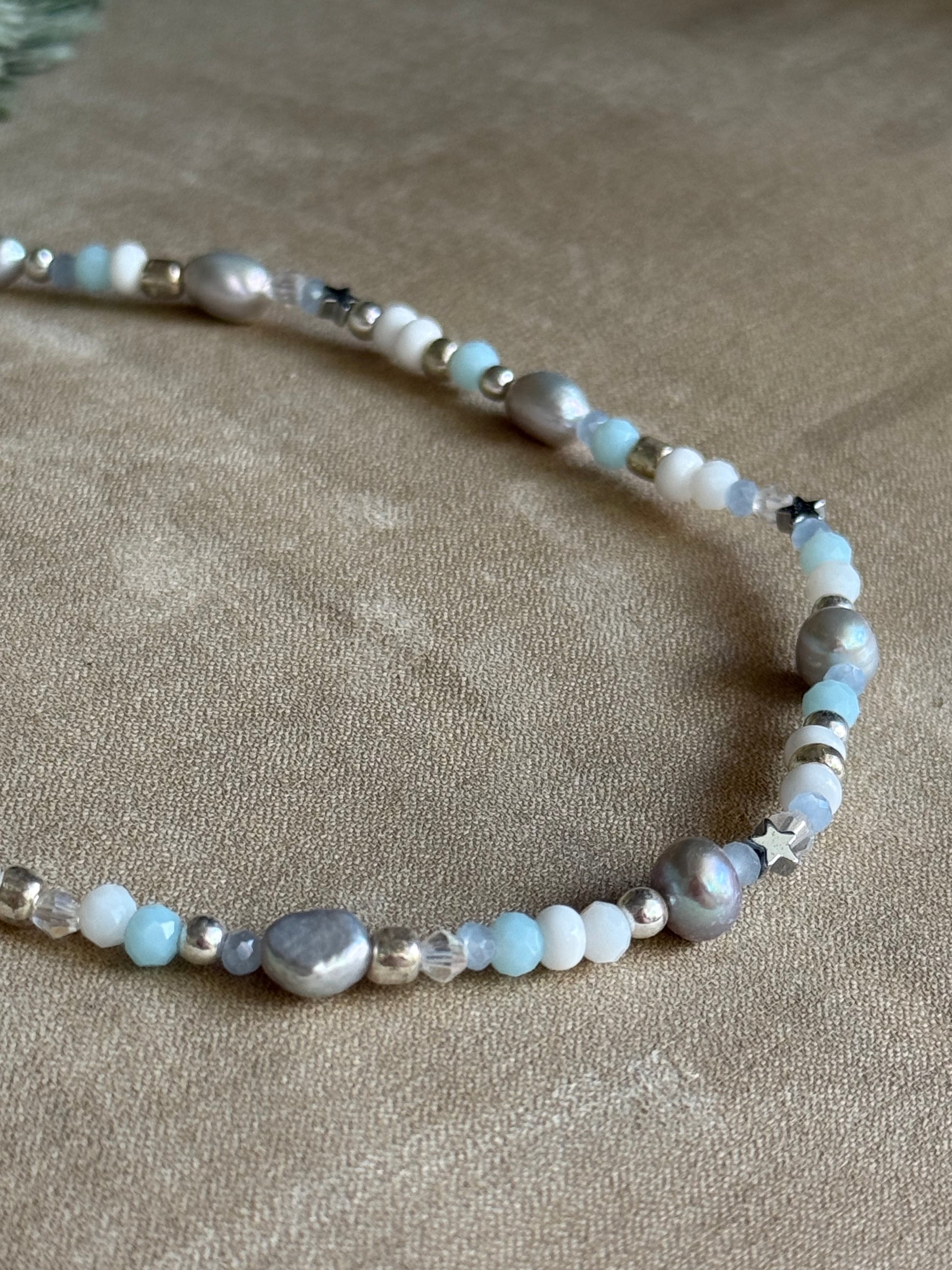 Notre collier ras de cou Laponie, évoque les soirées étoilées, la glace et la lumière douce. Il apporte une touche d’élégance et de sophistication à votre look, grâce à ses jolies perles d’eau douce naturelles grises, ses petites étoiles en hématites et ses perles à facettes. Fabriqué artisanalement, avec un fermoir en acier inoxydable, ce collier est robuste et durable, vous assurant un look élégant longtemps. Vous pouvez le porter au quotidien sans qu’il ne ternisse.
