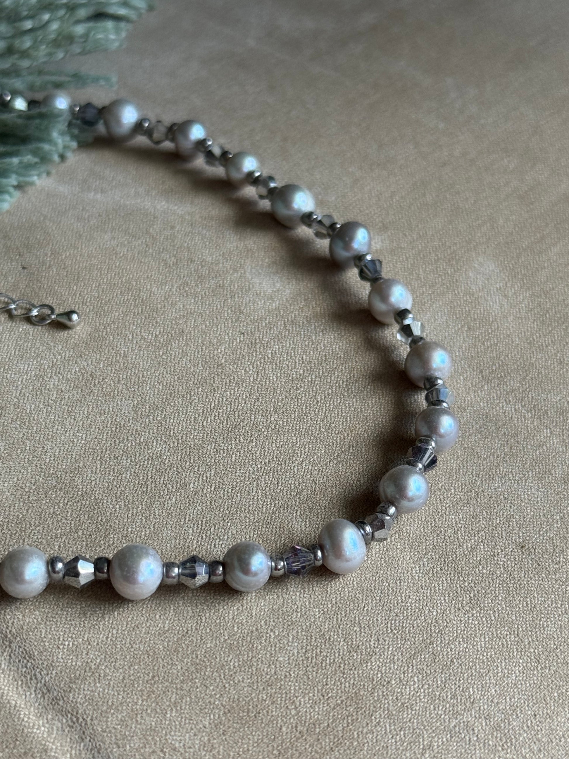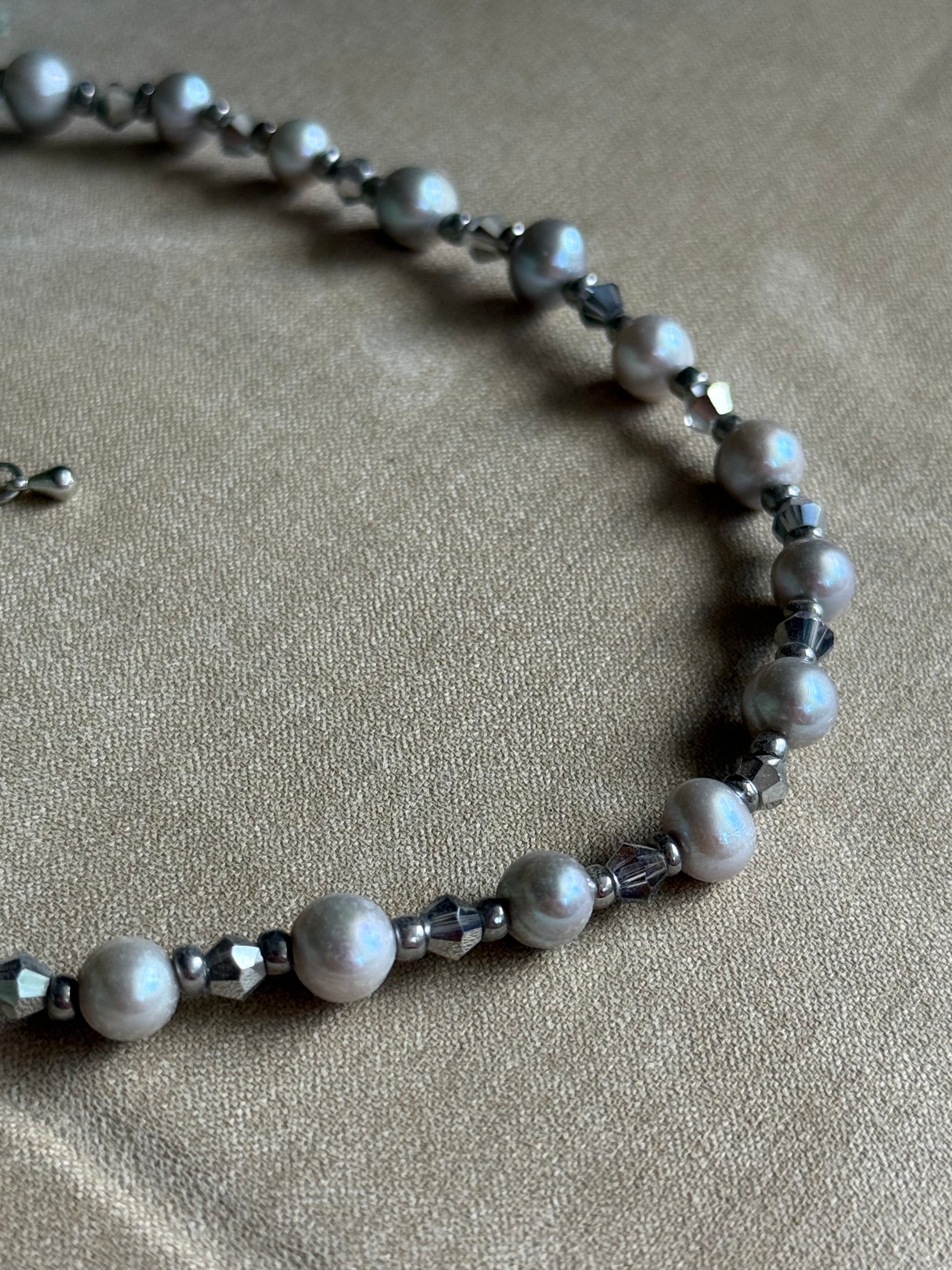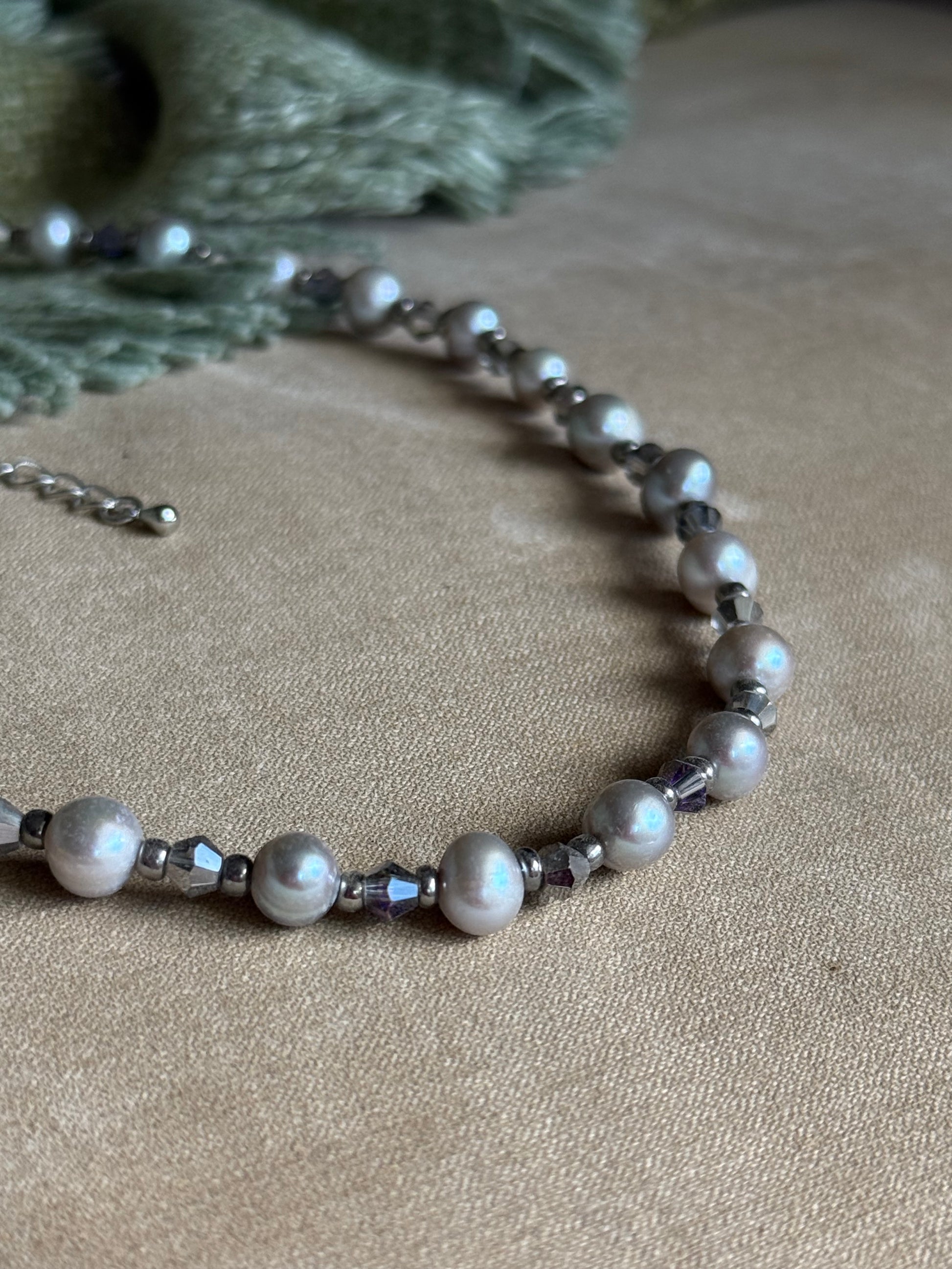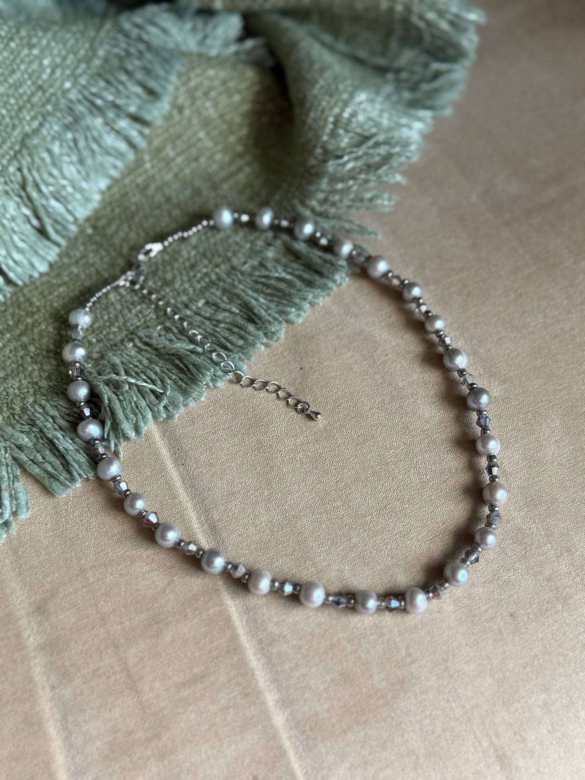 Notre collier Skye en ras de cou , vous transporte jusqu’en Écosse, où l’argenté domine le paysage. Il apporte une touche d’élégance et de sophistication à votre look, grâce à ses jolies perles d’eau douce naturelles grises et ses perles à facettes. Fabriqué artisanalement, avec un fermoir en acier inoxydable, ce collier est robuste et durable, vous assurant un look élégant longtemps. Vous pouvez le porter au quotidien sans qu’il ne ternisse.