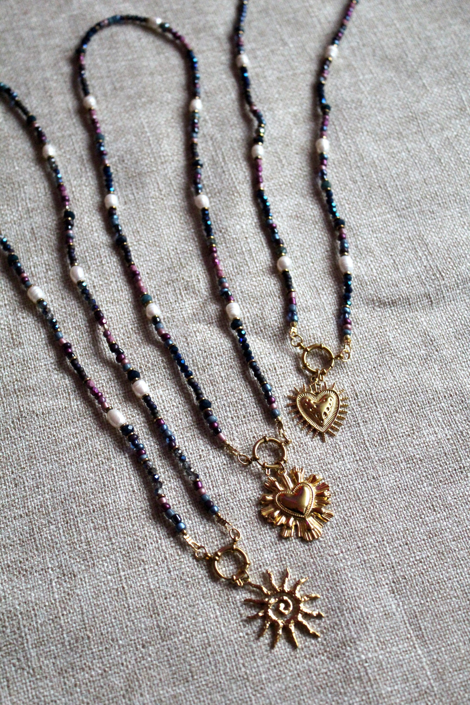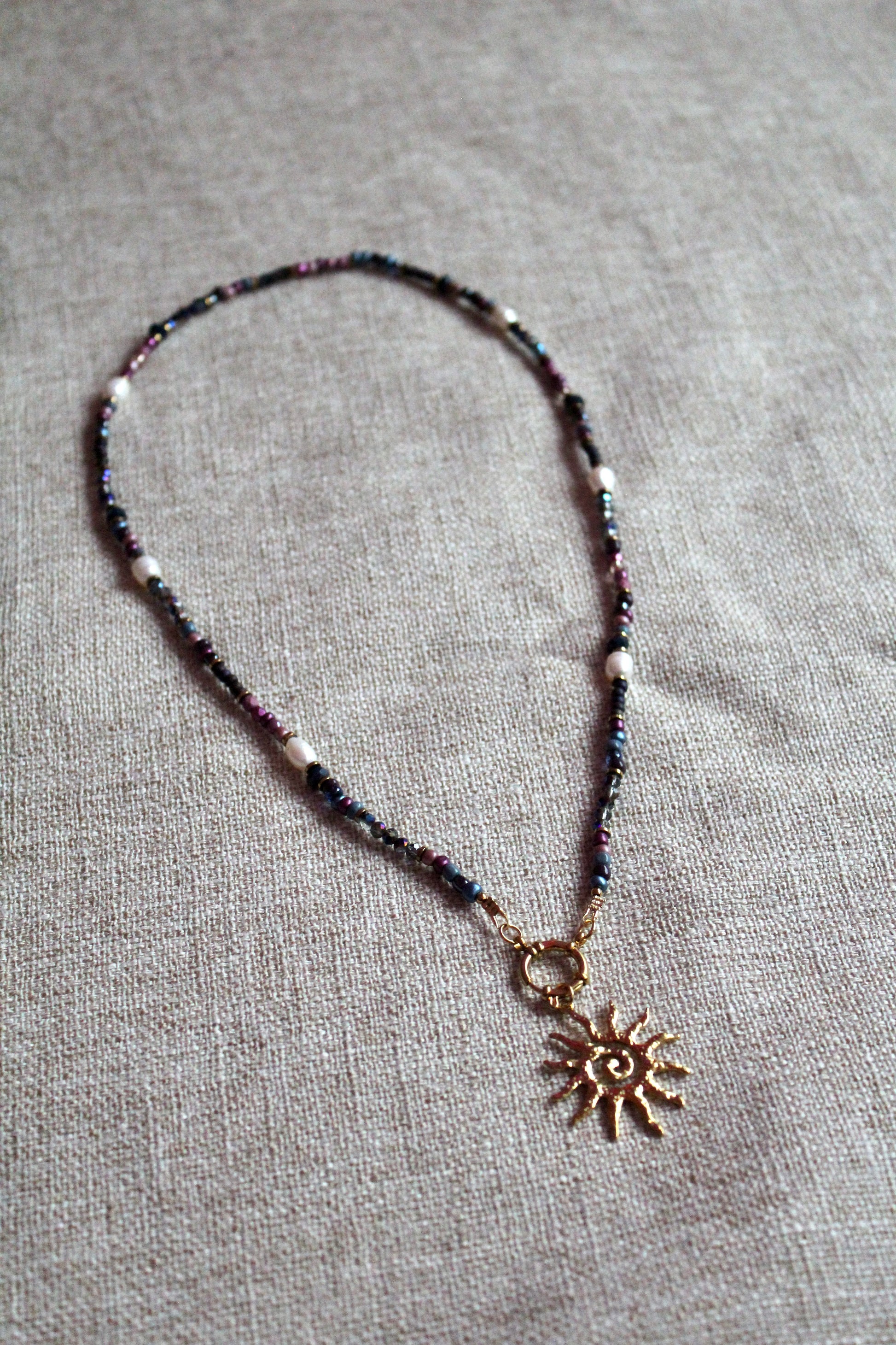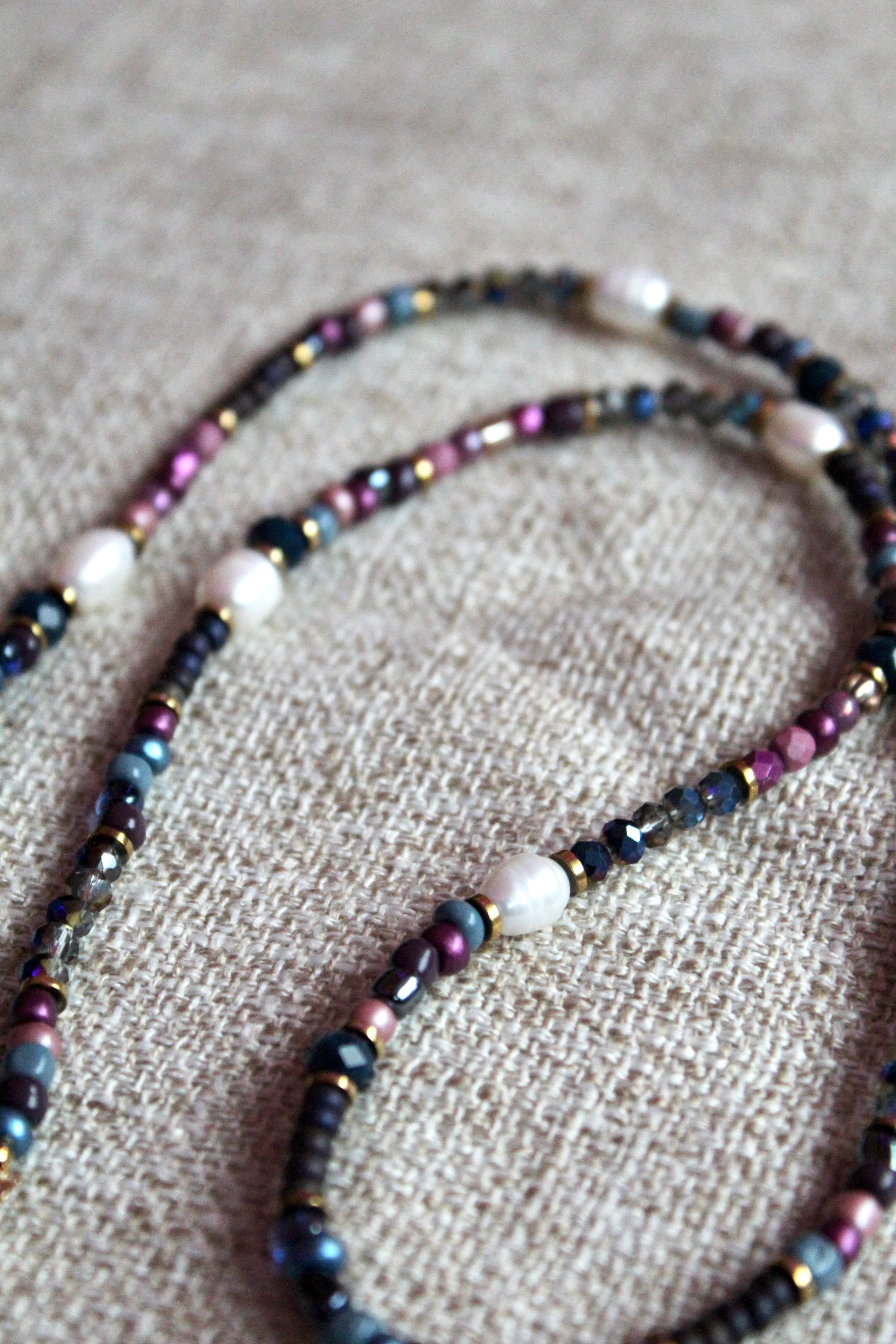 Un sautoir, aux couleurs de l’hiver pour vous transporter jusque dans les pays nordiques où les aurores boréales dansent dans le ciel. Son camaïeu de bleus, violets et roses ainsi que ses perles d’eau douce naturelles en font une pièce chic et originale, des plus uniques pour égayer votre look hivernal.