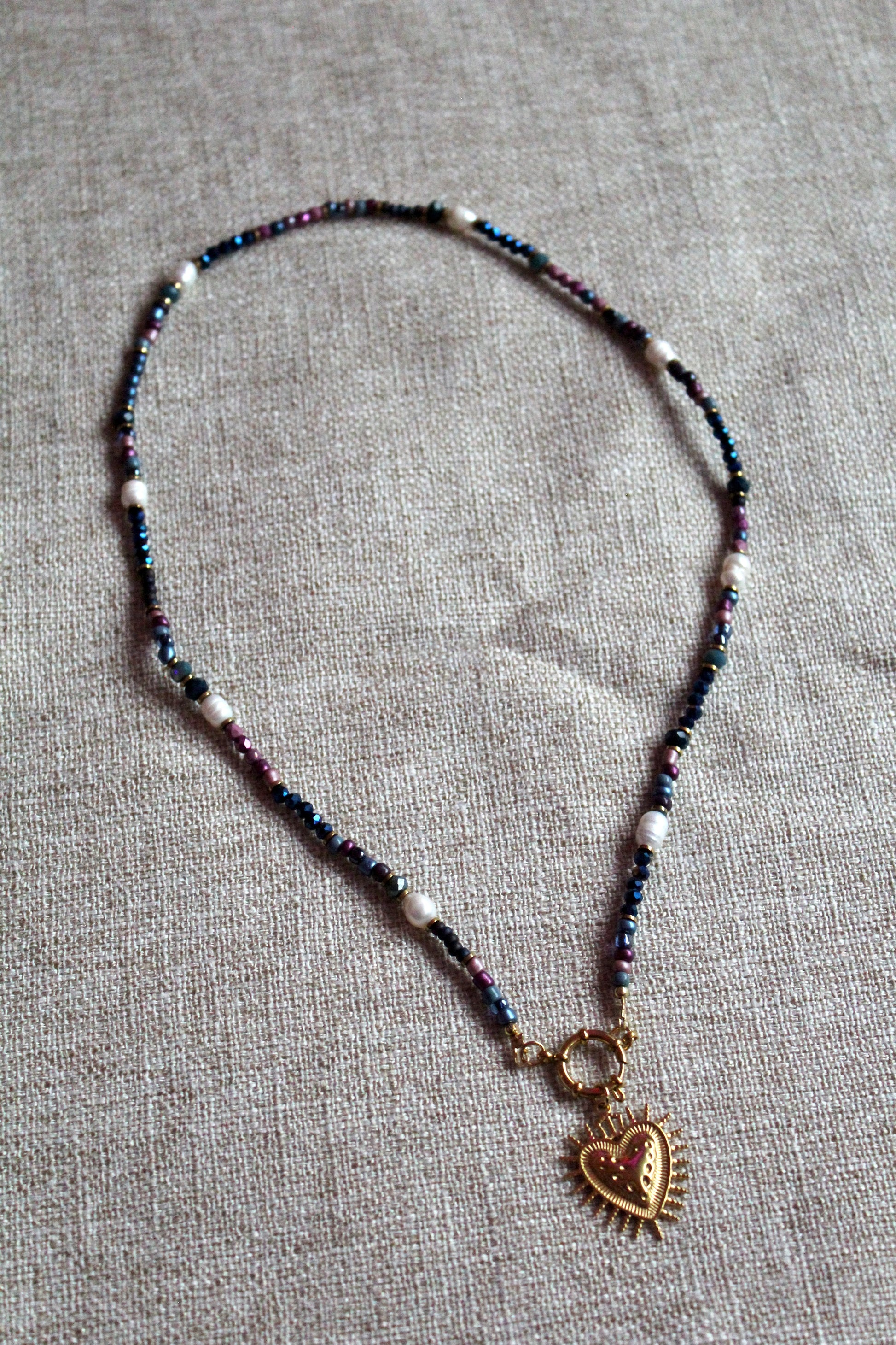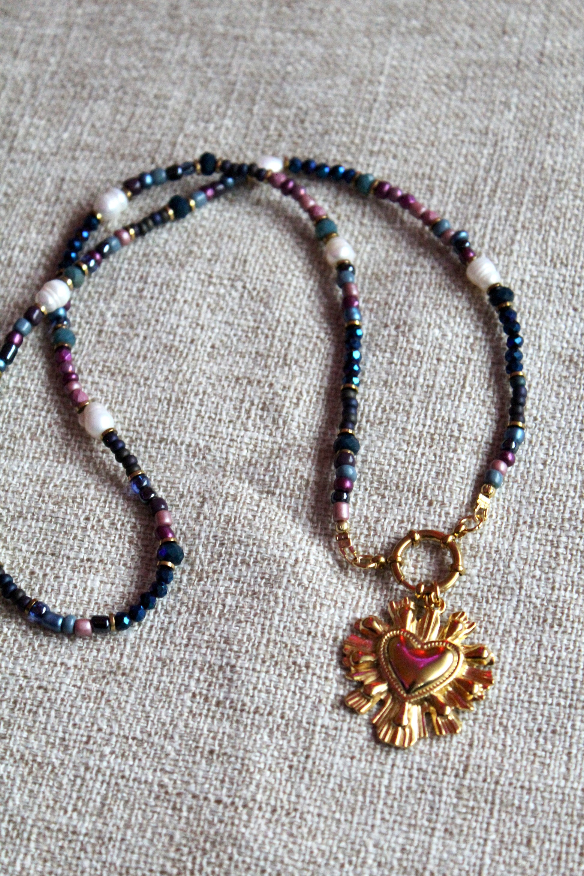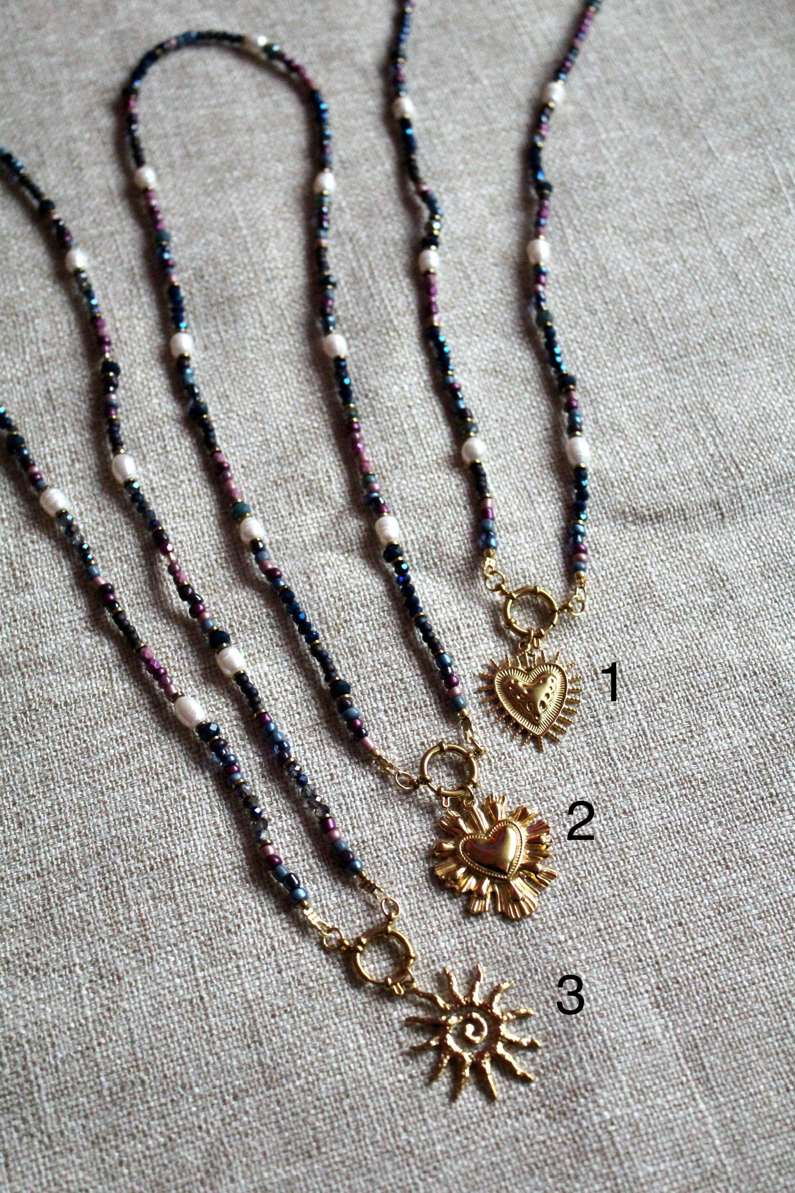 Un sautoir, aux couleurs de l’hiver pour vous transporter jusque dans les pays nordiques où les aurores boréales dansent dans le ciel. Son camaïeu de bleus, violets et roses ainsi que ses perles d’eau douce naturelles en font une pièce chic et originale, des plus uniques pour égayer votre look hivernal.